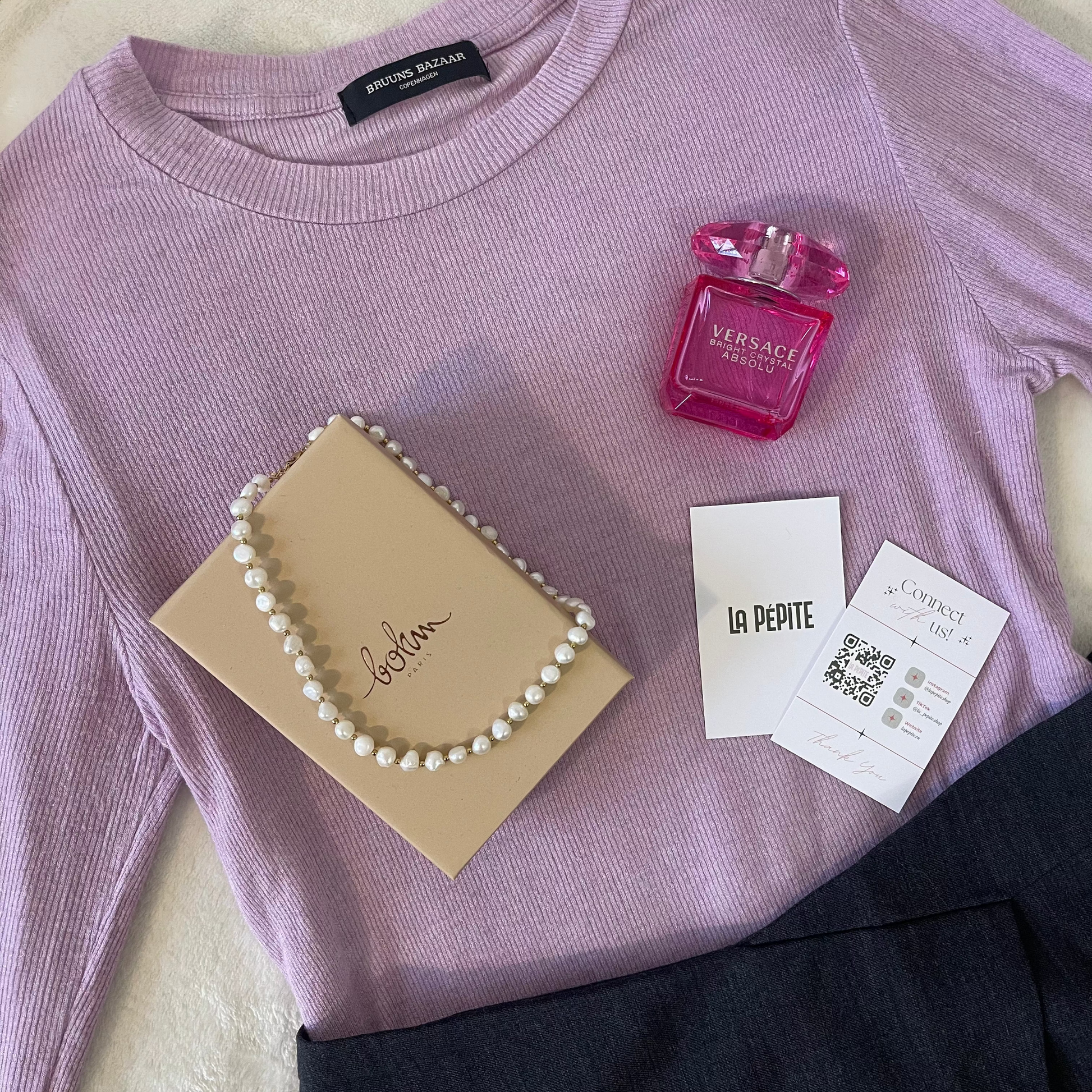 Oгърлица, украсена с мъниста от неръждаема стомана и сладководни перли.